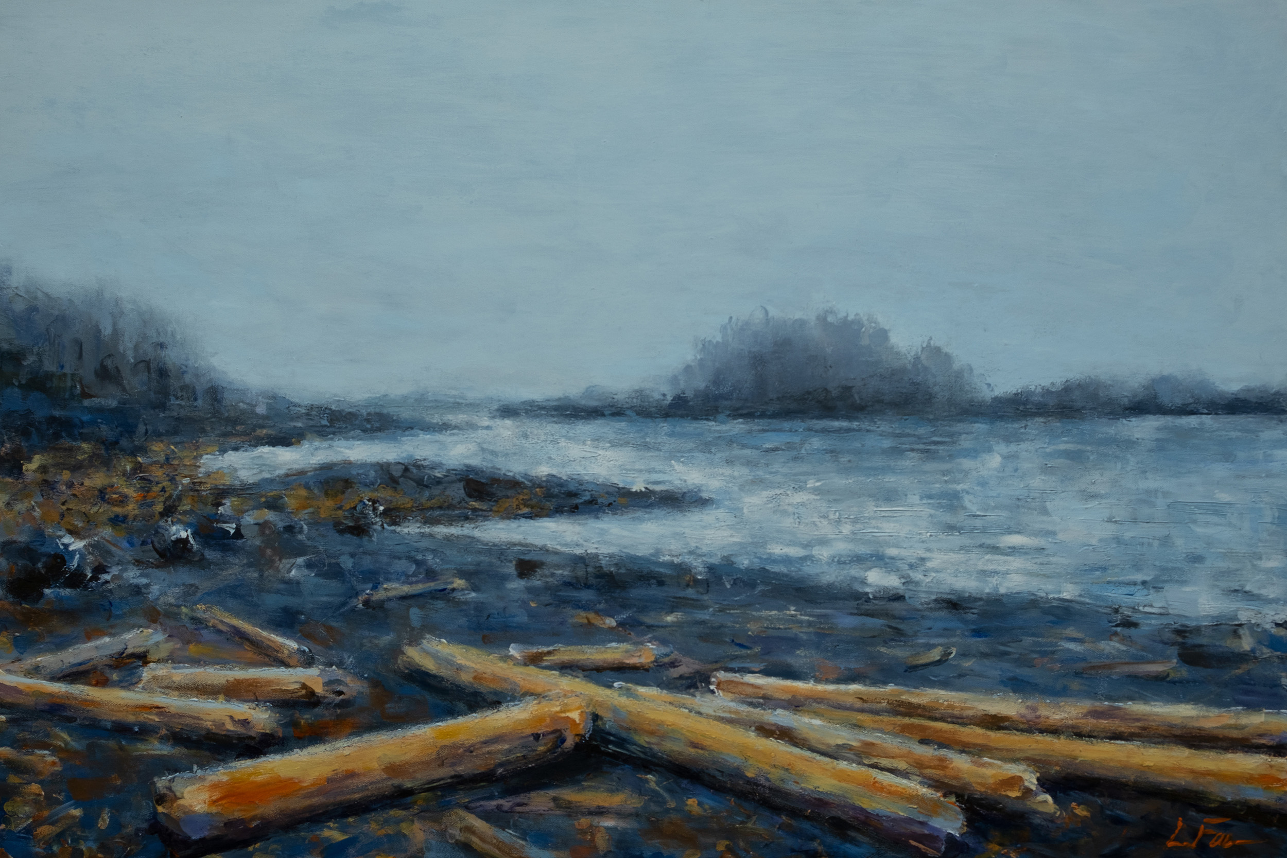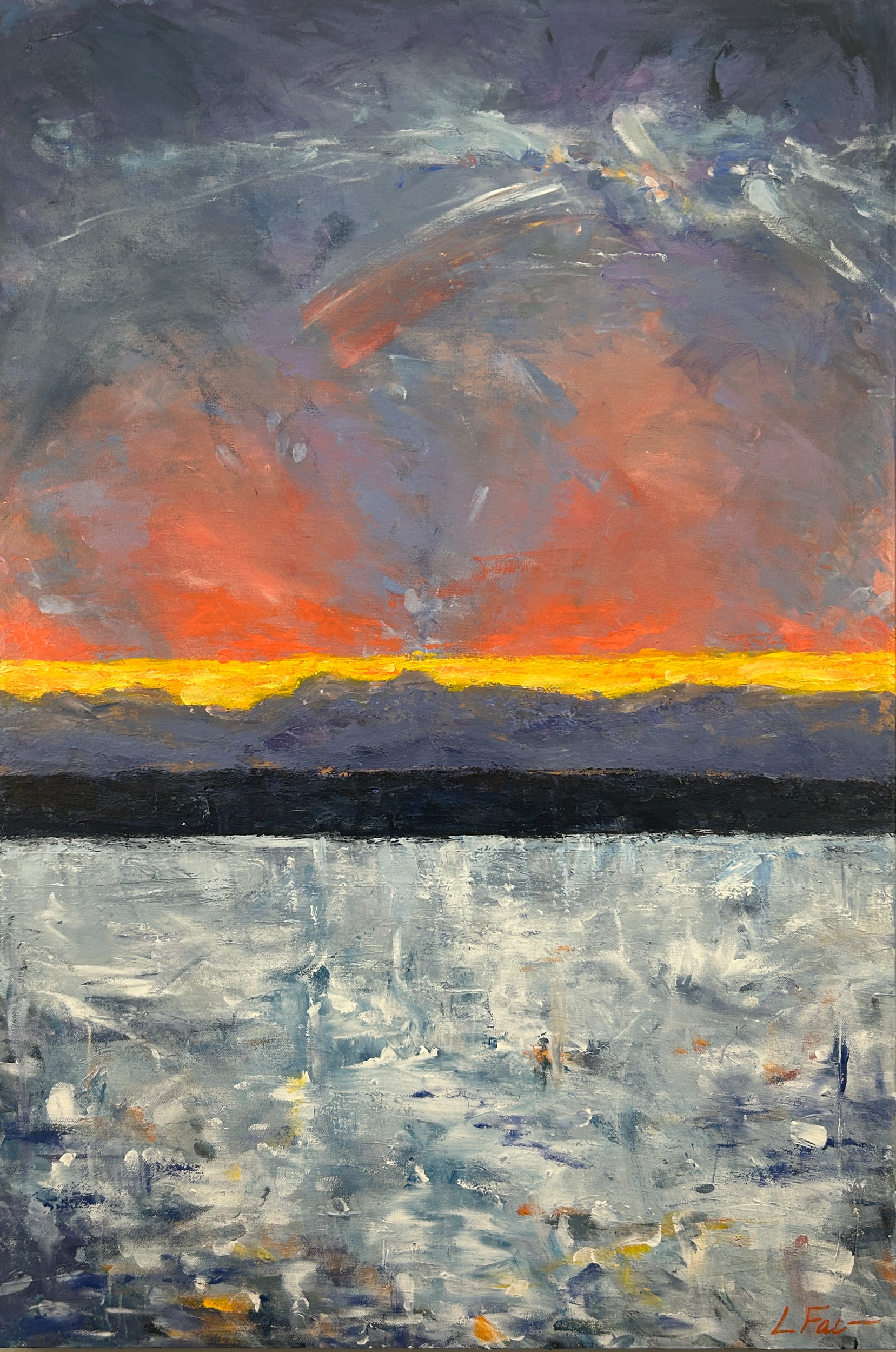 The sun sets, boats seem to come to rest. Almost-black paint renders charred edges, framing a moment of calm, an attempt to still. Yet long lineations suggest a haze, a shimmer, things not quite fixed.