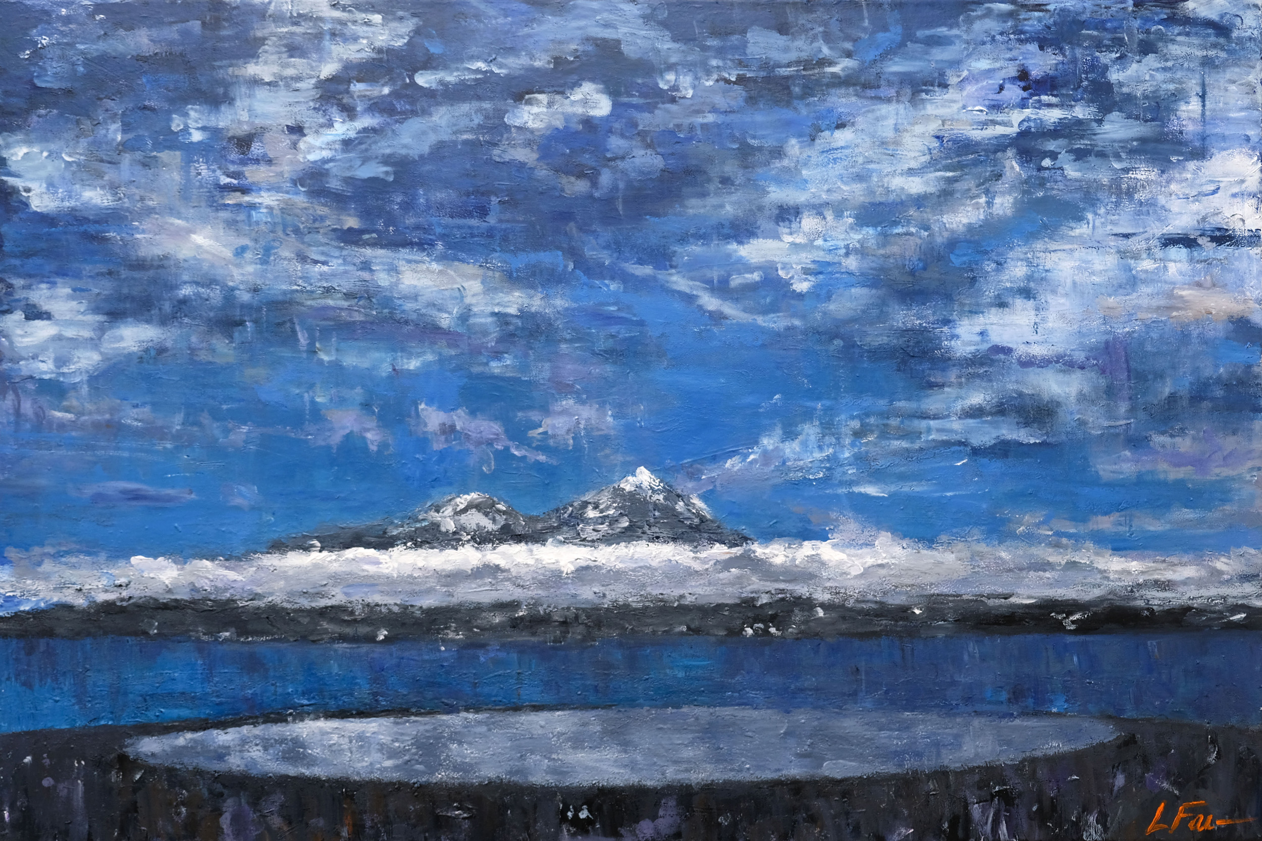 Underpainting of azo gold is a brilliant stretch of sand coloured by the lazy warm light. Dazzling gemstone water grazes the shoreline and stretches off to a hazy horizon line. Impossibly burnished clouds frame the sky above whispers of boats.